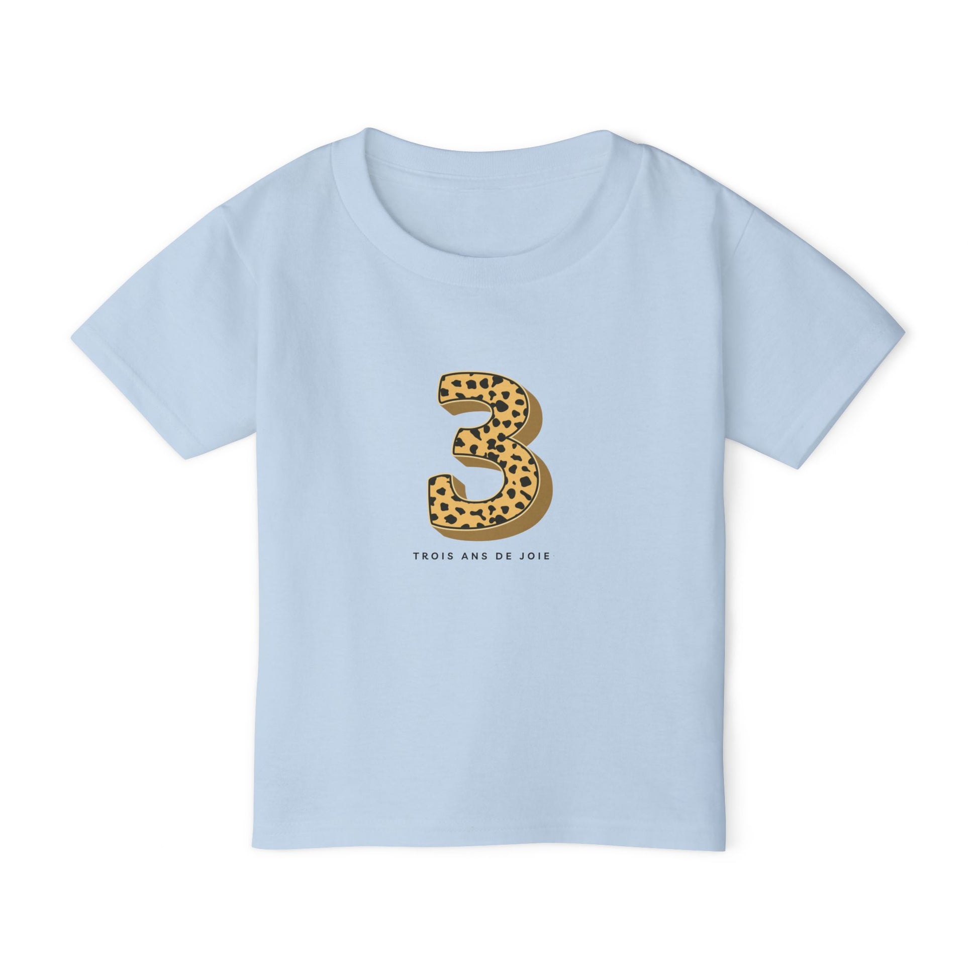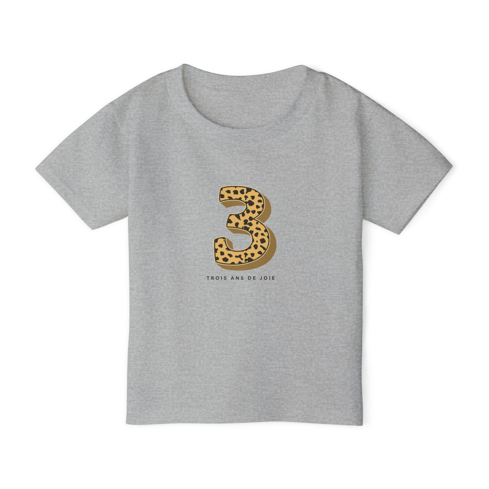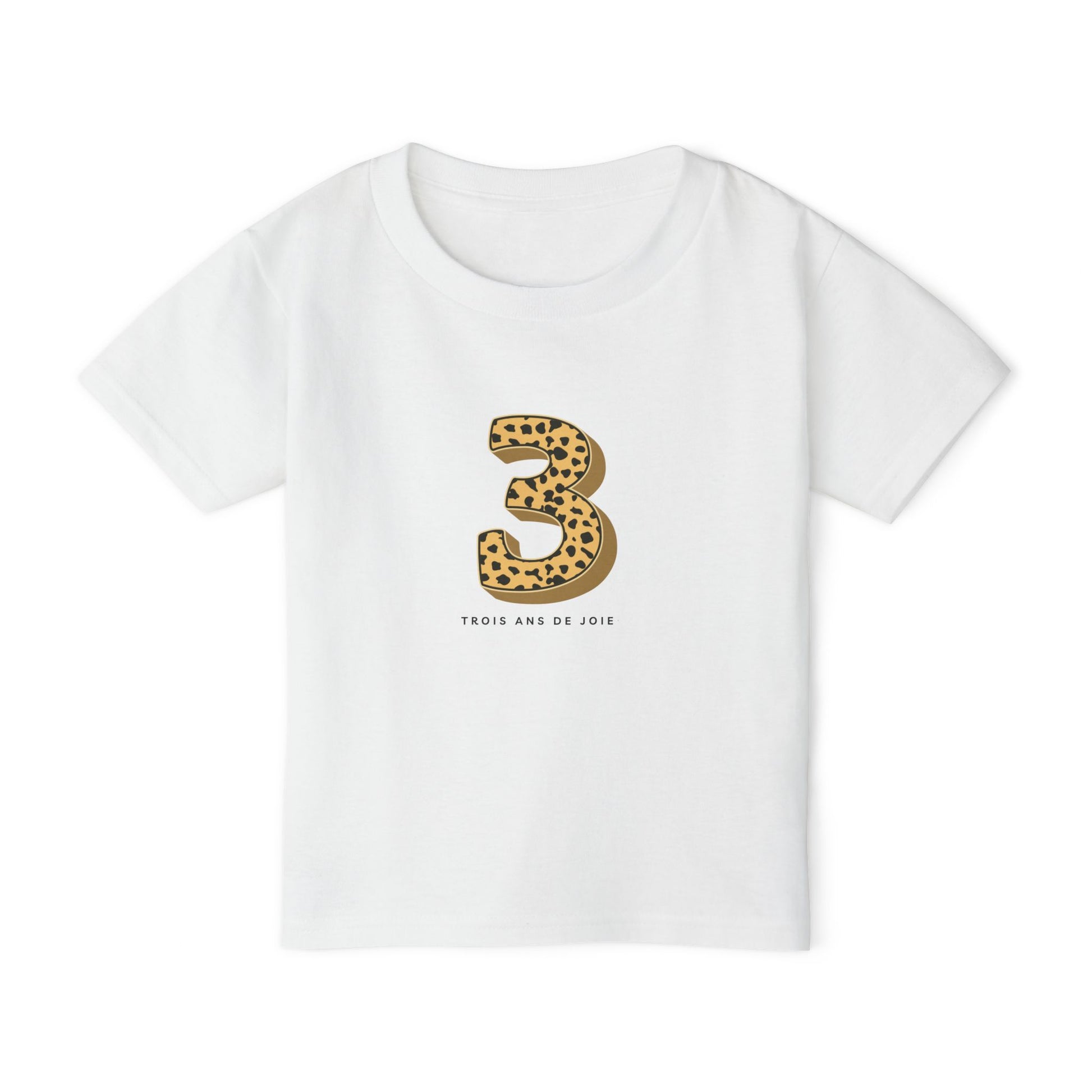 Celebrate your little one's special moments with this 3-year-old Birthday Toddler T-shirt with a dash of animal print. Crafted from soft, breathable cotton, this tee provides all-day comfort, making it perfect for playdates, parties, or just lounging around the house. The Tee reads "trois ans de joie" - three years of fun. The playful design adds a whimsical touch, ideal for birthdays, holidays, or family gatherings. Great for children aged 1-5, this shirt is a wonderful gift for new parents or as a fun addition to any toddler's wardrobe. Dress your little one in style and let their personality shine!