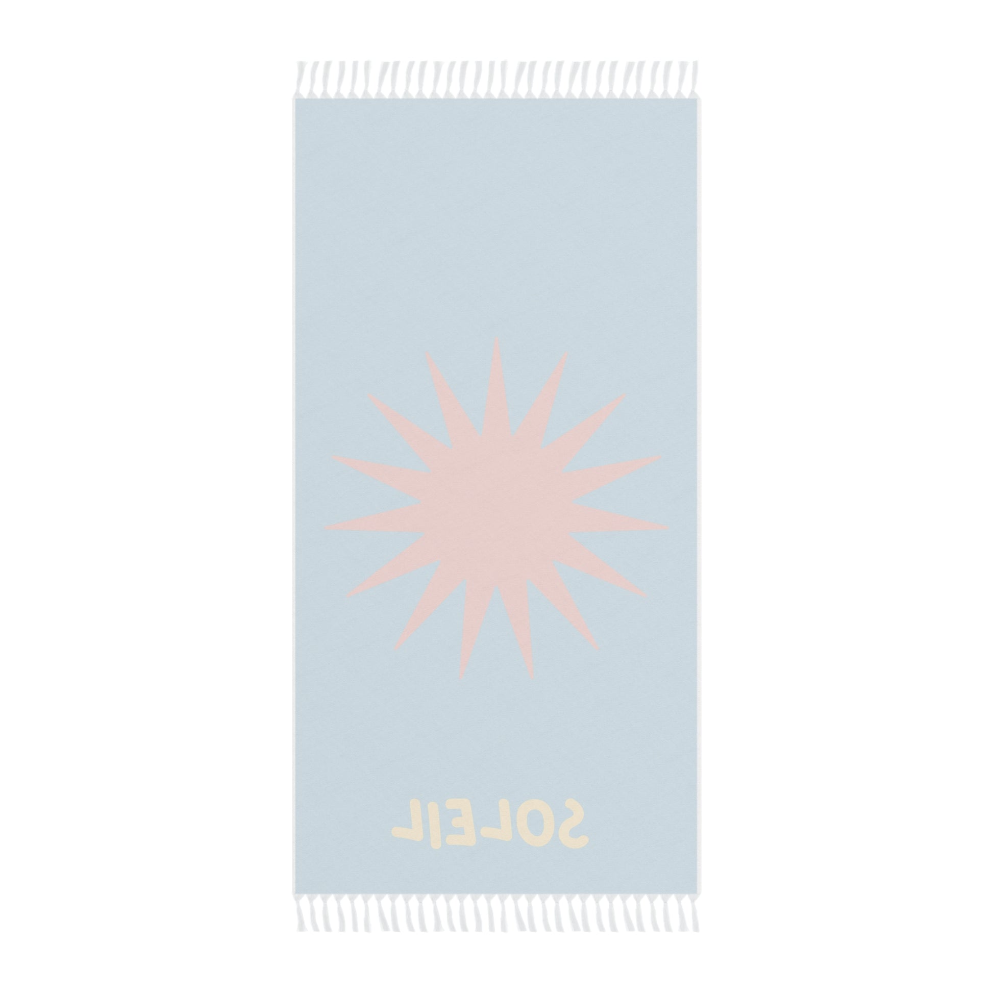 Lightweight, sunlit, and entirely travel-ready — this beach cloth brings a bohemian summer mood to every shoreline and picnic blanket. The design features a bold sun and the word “SOLEIL,” laid out in warm, retro colors that pop against a cool background. The long, narrow shape and knotted tassel edges give it a vintage beach-blanket vibe that folds small in your bag and dries fast after a dip. Spread it on sand, drape it over a picnic bench, or use it as a scarf or shawl for breezy evenings. It sits naturally in the rhythm of days spent chasing light and laid-back ocean air. A matching oversized Beach Tote is also available.