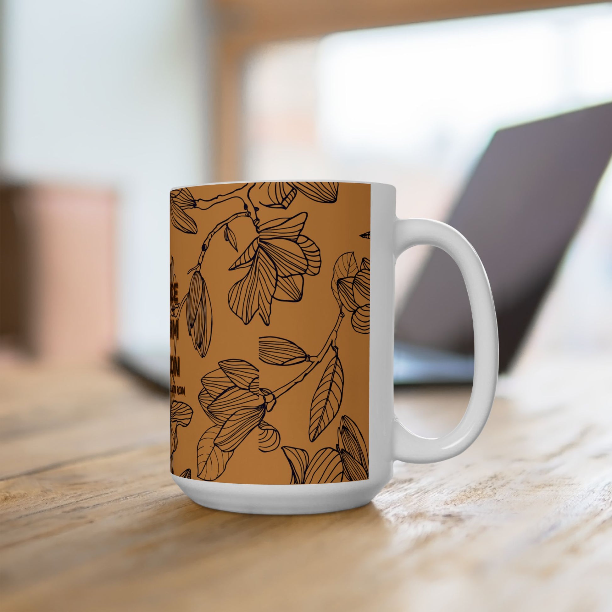 Warm ochre blooms and hand-drawn linework wrap this ceramic mug like a quiet morning. The design pairs a thoughtful quote—"Patience is a form of action" -from sculptor Auguste Rodin—with delicate floral sketches, creating a calm, reflective tone that slips easily into daily rituals. It feels like a pause between tasks: a slow sip, a deep breath, a small moment of clarity.